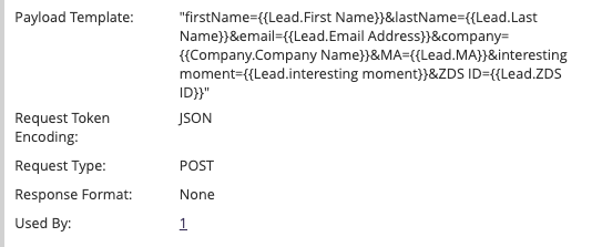 In order to get this working for the client. We had to create a custom webhook inside of Marketo with a payload template calling out the interesting moment as well as key information to find the correct lead inside of Zendesk such as first, last, email and lead ID